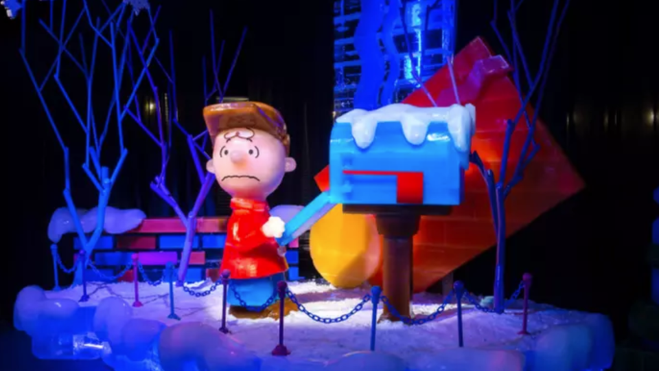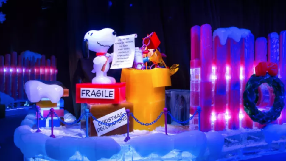 Visitors can explore a winter wonderland filled with beautifully carved ice sculptures depicting scenes and characters from the classic television special, “A Charlie Brown Christmas.”